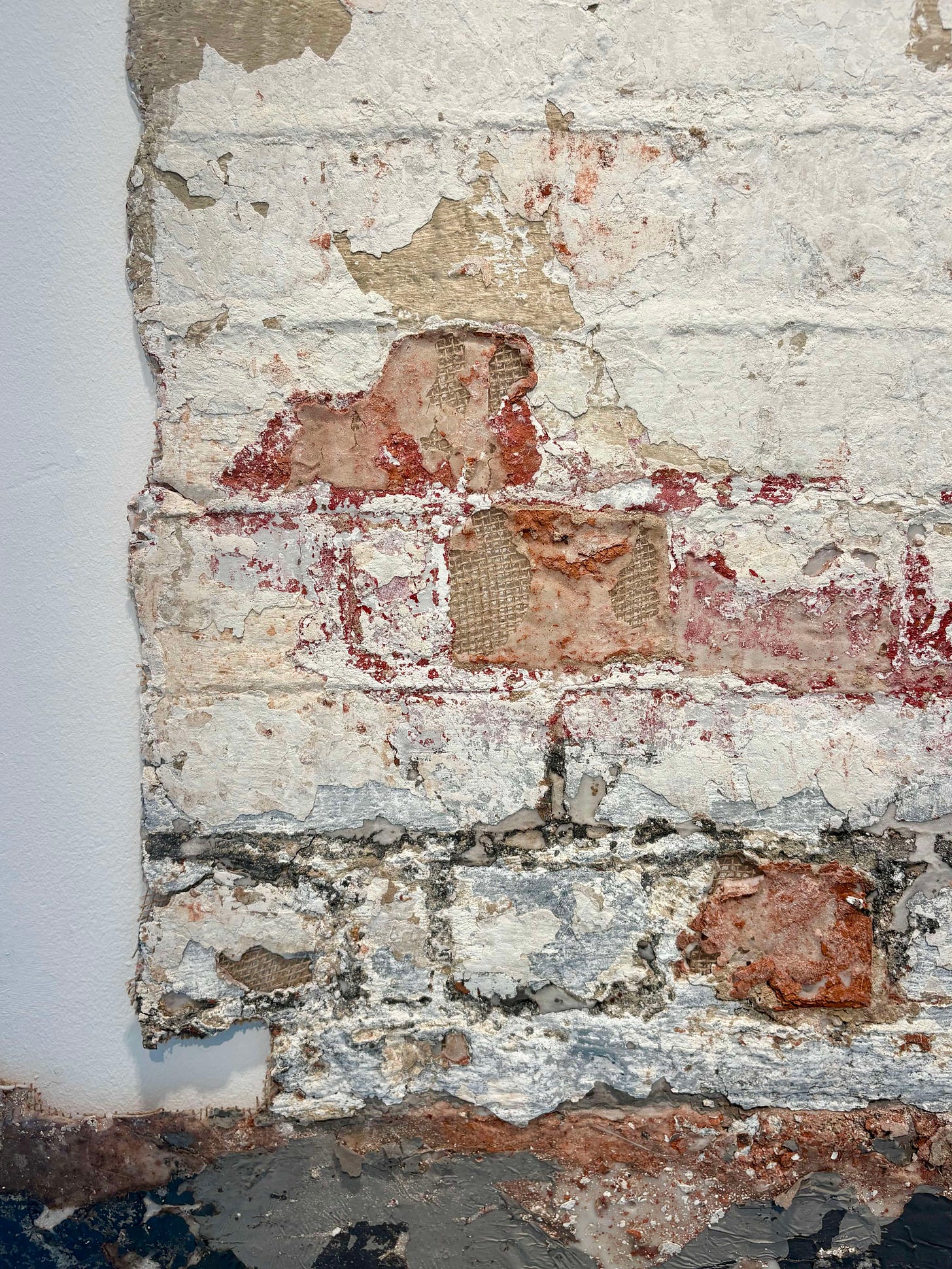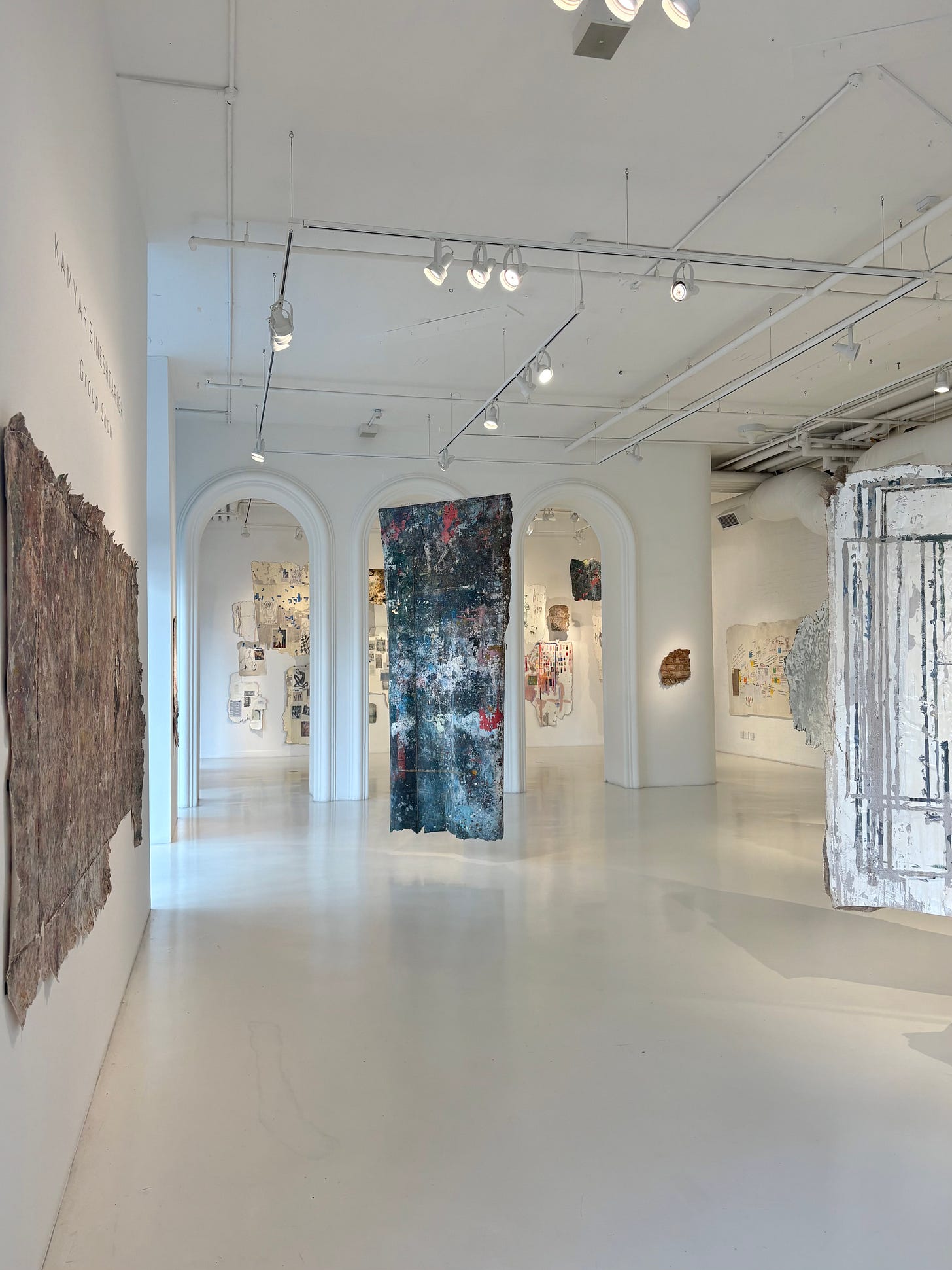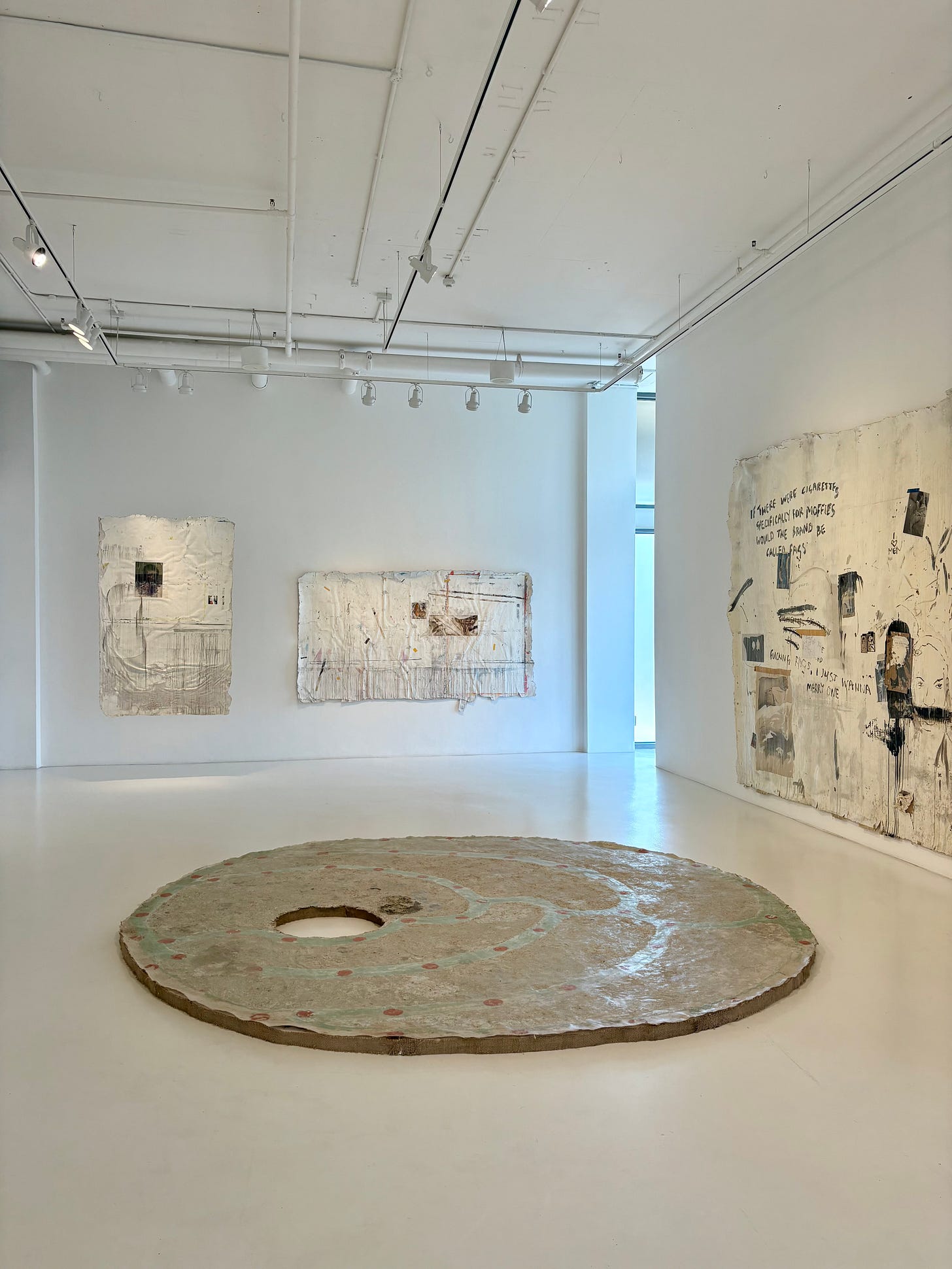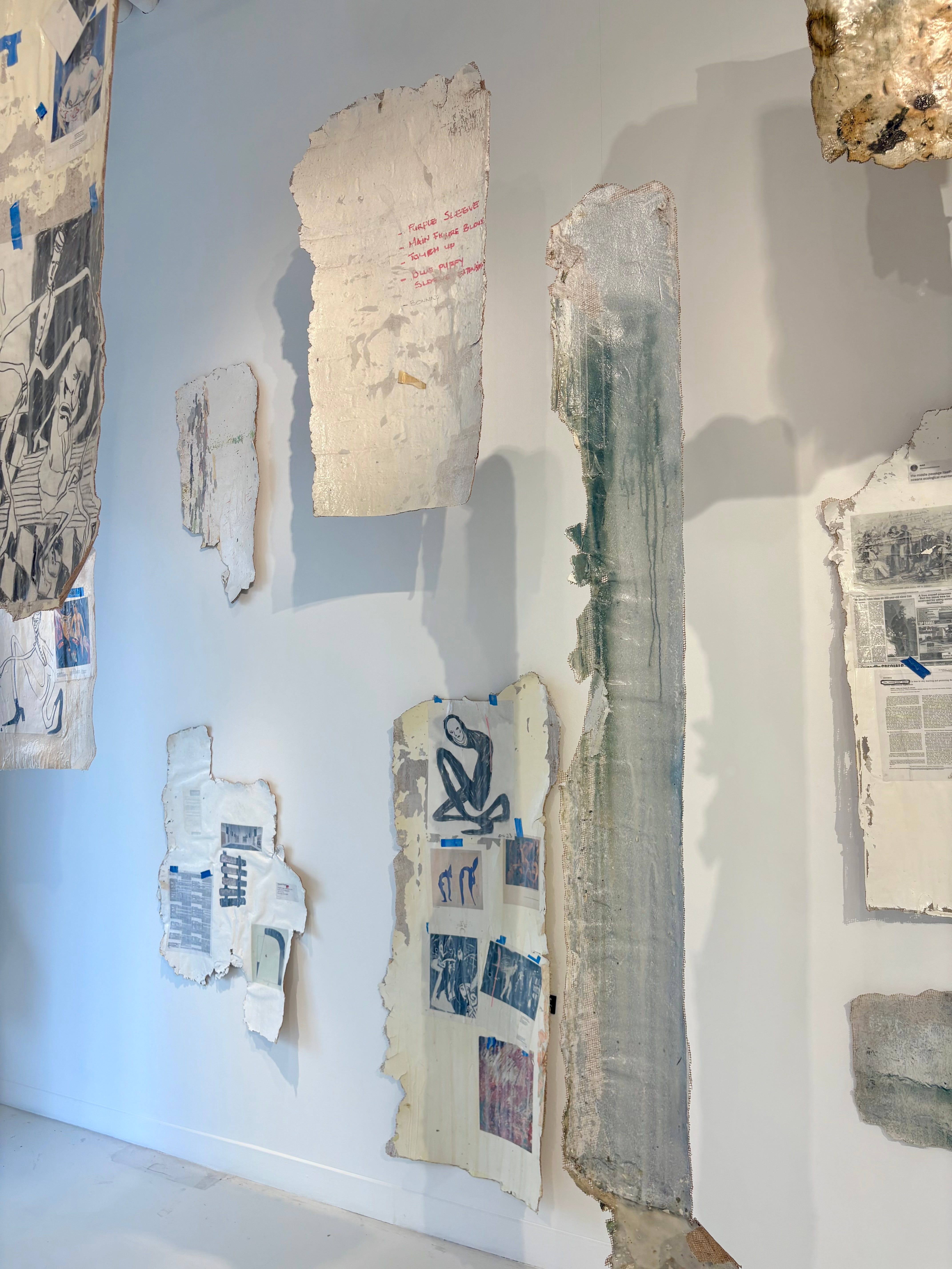 When visiting, I was first greeted by these ephemeral hanging tablets and then by a gallerist who kindly handed me a printed copy of Thulile Gamedze’s exhibition text, ‘Transfer, Memorial, Exposure: The Studio Samples of Kamyar Bineshtarigh.’ Next to greet me was a warm feeling as I looked out around the gallery, listening to my friend bring the exhibition to life with their personal reflections on the works, text, and the experience of bringing the show together into a cohesive whole. This tender-hearted feeling swelled within my chest as I learned the names of artists who offered their studio spaces for collaboration with Bineshtarigh, whose work employs a cold-glue transfer technique to create ghostly castings of surfaces- in this case, the walls and floors of artists’ studios across the country.
