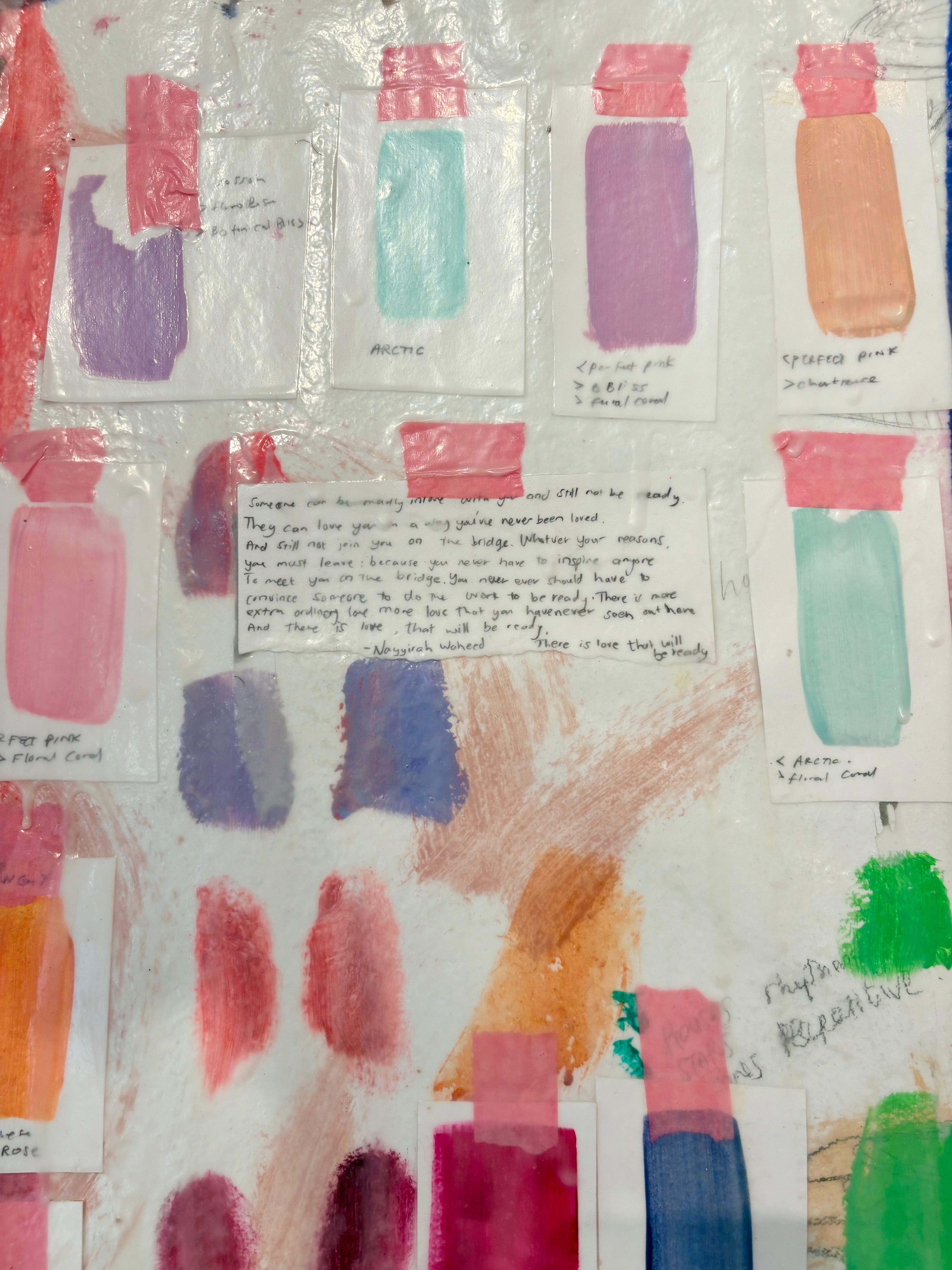 Across the room, the wall vinyl read: “with gratitude to the following artists,” and as I skimmed the list of collaborating creatives, I recognised the collective strength found in the interconnectedness of this industry- much like the sturdy hessian that supports the almost skin-like studio ghost-bodies of Bineshtarigh’s transfers; acknowledging artists I have worked with, researched, and even some I know as friends. This quickly became a playful game of noticing: could I carefully observe the landscape of each transfer and deduce the artist reflected within, without consulting the artwork list? A little Gallery-Guess-Who… And in the fleeting marks, colourways, keepsakes, sentimental springboards, and quiet messages to oneself, my mind began to find markers that pointed beyond the evanescence of style (often a strong focus in our world), to the oftentimes overlooked joy of personality.